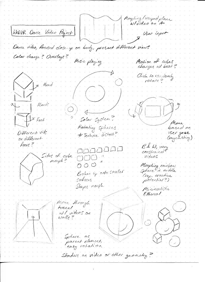 I recorded six videos of a friend dancing and mapped them to planes around a sphere in Three.JS, then wrote gaze raycasting controls that would allow the user to rotate the sphere and get an unique perspective on the dancer’s movement. The implementation involved: