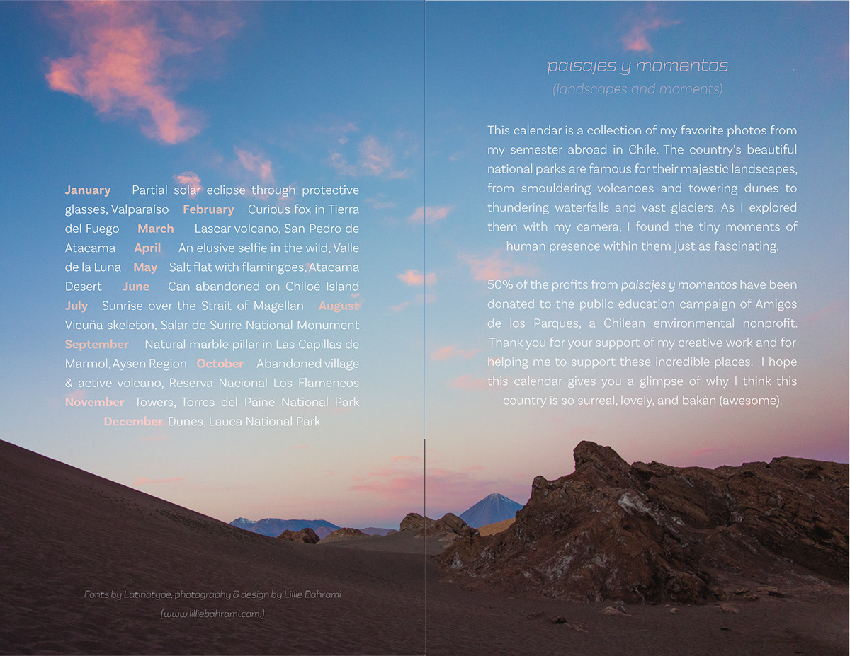 paisajes y momentos // "landscapes and moments" is a photography calendar juxtaposing the vast beauty of Chile's diverse wildernesses and the tiny but impactful human presences within them. All profits from the sale of the calendar were donated to the Chilean nonprofit Amigos de los Parques // "Friends of the National Parks".