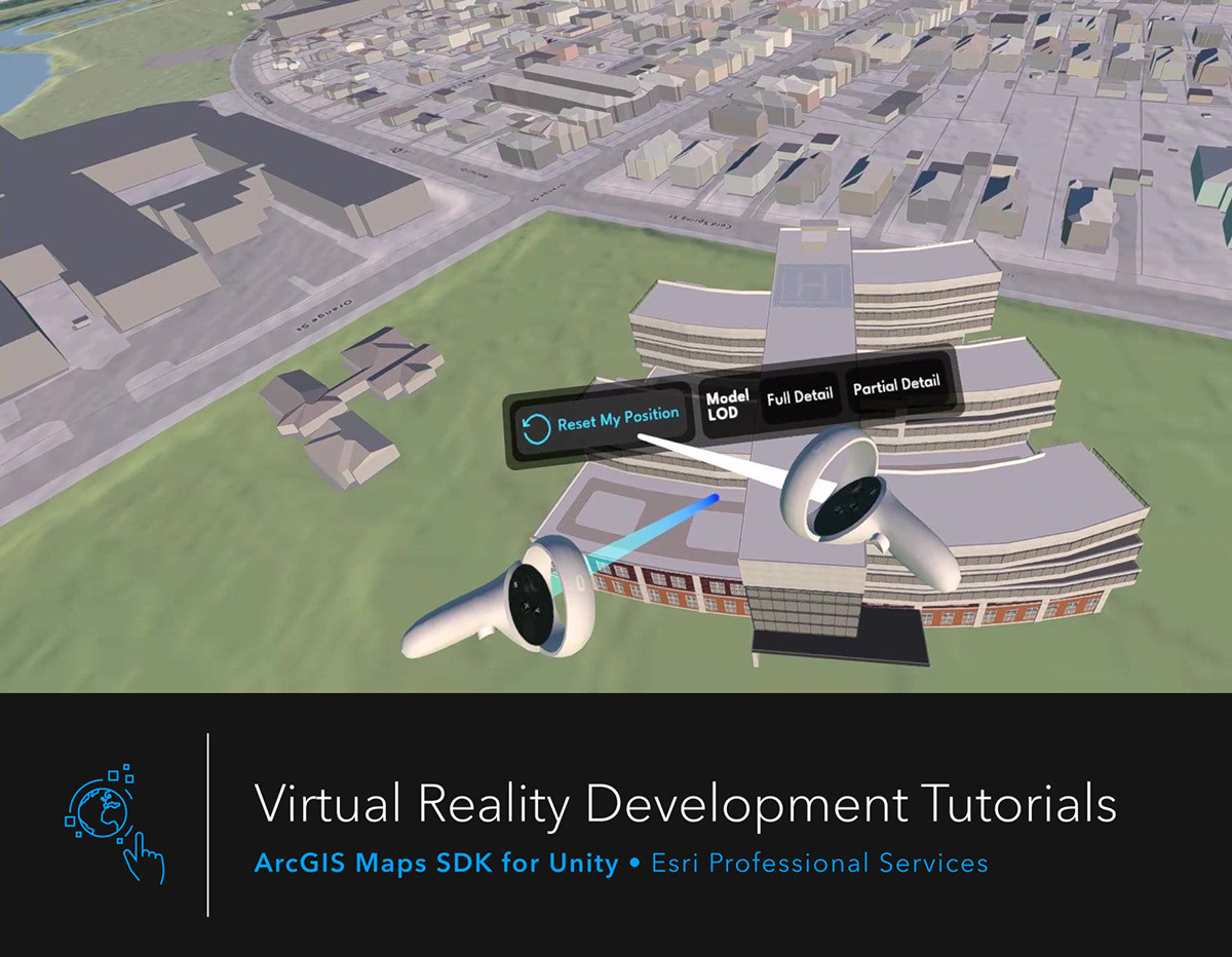 Screenshot from the VR application. The viewer is flying over a scale model of a building and hovering over a button on their fixed UI bar that says "Reset My Position". The title reads: "Virtual Reality Development Tutorials, ArcGIS Maps SDK for Unity, Esri Professional Services."